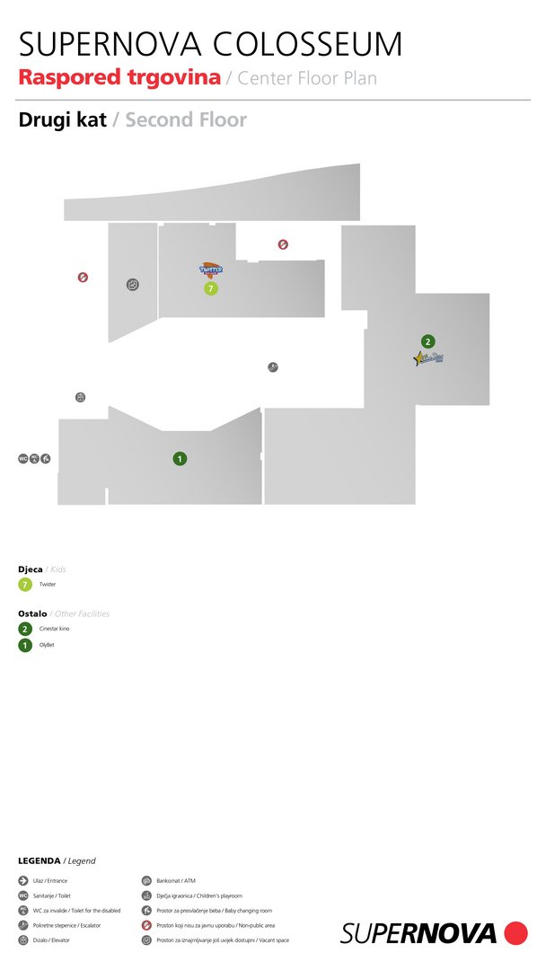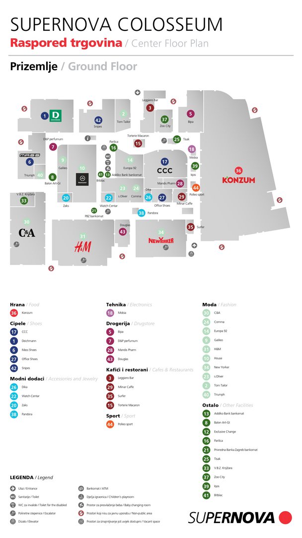 Ovdje možete pogledati mapu shopping centra Supernova Colosseum. Kliknite i provjerite naše trgovine i usluge!